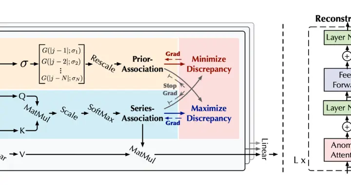 整体架构如上图所示,Anomaly-Attention(左)同时建模了数据的先验关联(Prior-Association,即更关注邻近区域的先验)和序列关联(Series-Association,即从数据中挖掘的依赖)。
