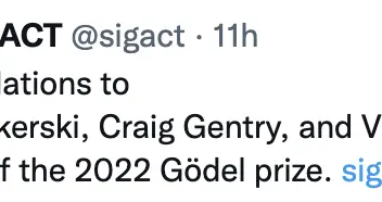 ACM算法与计算理论兴趣组(SIGACT)宣布,2022年哥德尔奖授予Craig Gentry,Zvika Brakerski以及Vinod Vaikuntanathan,表彰其对密码学做出的革命性贡献。