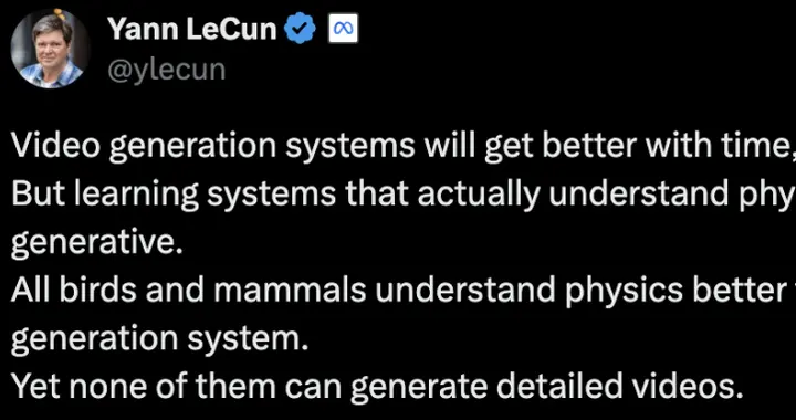 「不过,真正理解物理的学习系统将不是生成式的。所有的鸟类和哺乳动物,比任何视频生成系统更了解物理学。然而,他们都无法生成详细的视频」。