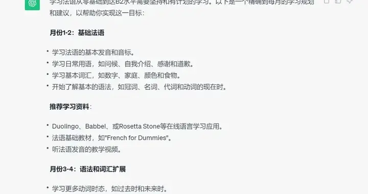 我们也可以向它学习自己感兴趣的任何知识:例如,作为一个法语小白,想学习法语,可以找大模型提问,让它给我制定学习计划,提供学习资料。