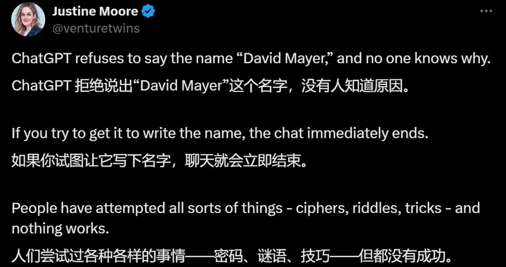 有网友总结道,根据代码解释器的试验,David Mayer问题应该不是模型层面的问题,而是基于输出的一些后续文本过滤器。
