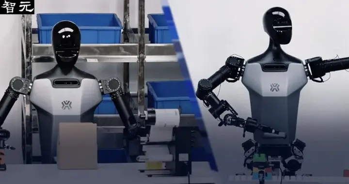 「天工」机器人左右手分别拿起物品和扫码枪,通过头部相机确认物品条形码位置,双手协同完成扫码、装箱、封箱及粘贴快递标签等一系列操作,最终将包装箱放于物流传送带上。