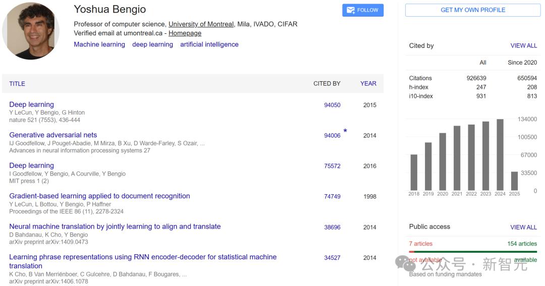 Google Scholar个人主页中,Bengio总被引数破90万,其中被引量最高的论文便是与LeCun和Hinton共同撰写的「深度学习」的论文。