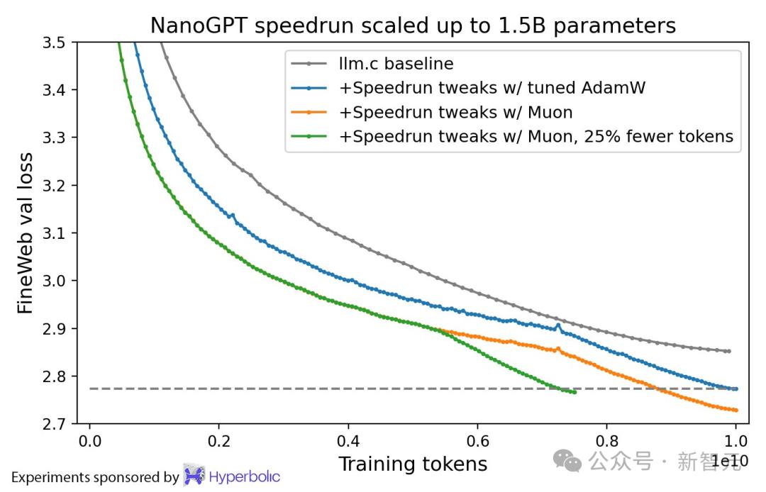 训练一个1.5B参数的Transformer模型达到GPT-2 XL水平,Muon仅需10个8xH100小时,而AdamW需要13.3小时,效率提升约25%。
