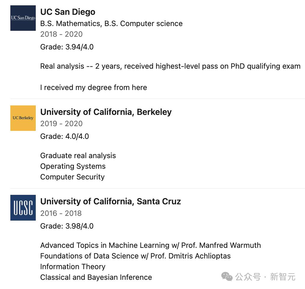 他于2020年获得了加州大学圣地亚哥分校数学和计算机科学双学士学位,也曾就读于加州大学圣克鲁斯分校和UC伯克利。