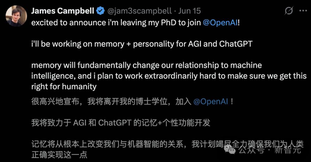 即便是没有获得博士学位,也可以入职OpenAI。昨天,James Campbell官宣放弃博士学位,要为ChatGPT和AGI引入记忆与人格。