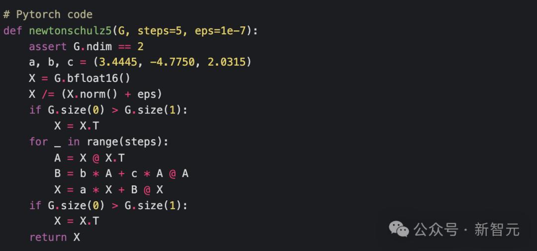 其核心思想是,SGD-动量法(SGD-momentum)生成的更新矩阵,通过Newton-Schulz迭代进行正交化处理,生成接近于半正交矩阵的更新,从而提升训练效率。