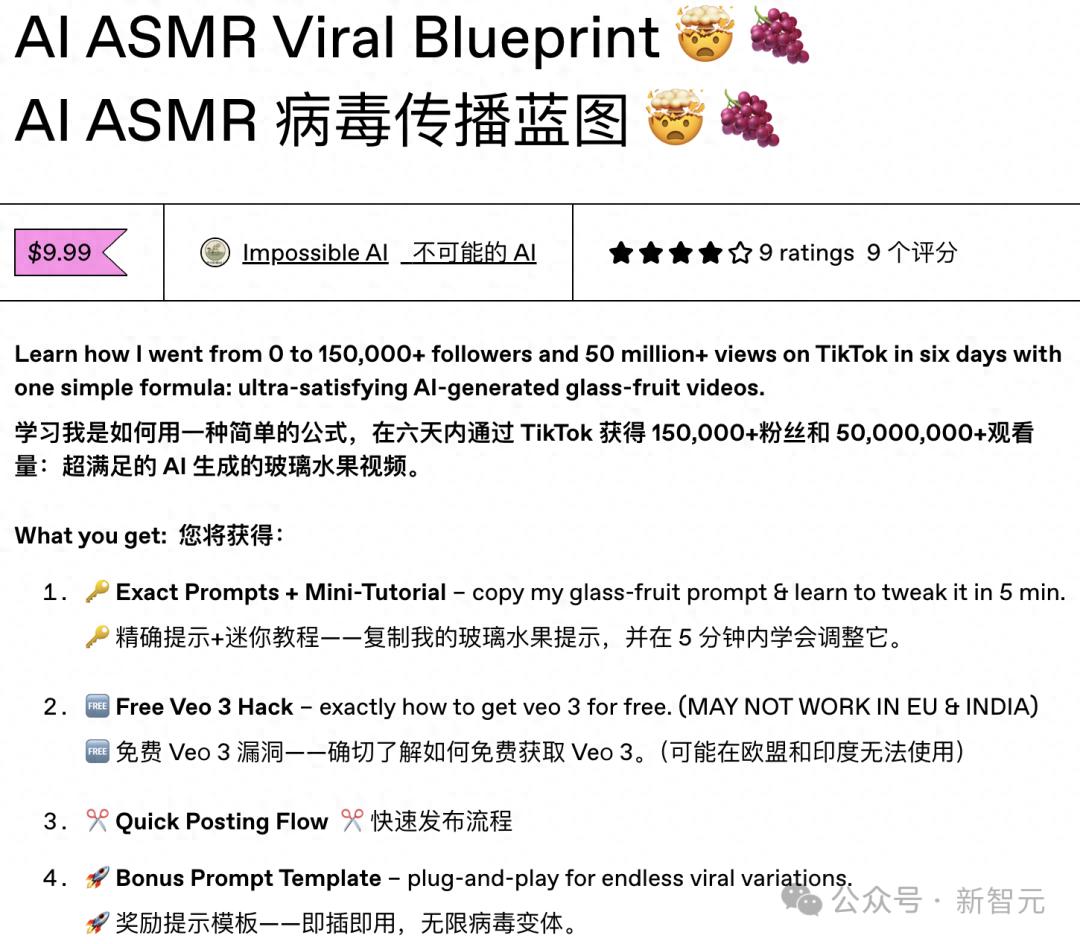 这些视频就像「大脑按摩」,让人「颅内高潮」甚至「起鸡皮疙瘩」,实在是太火了,现在网友本人$9.99出售「AI ASMR传播教程」。