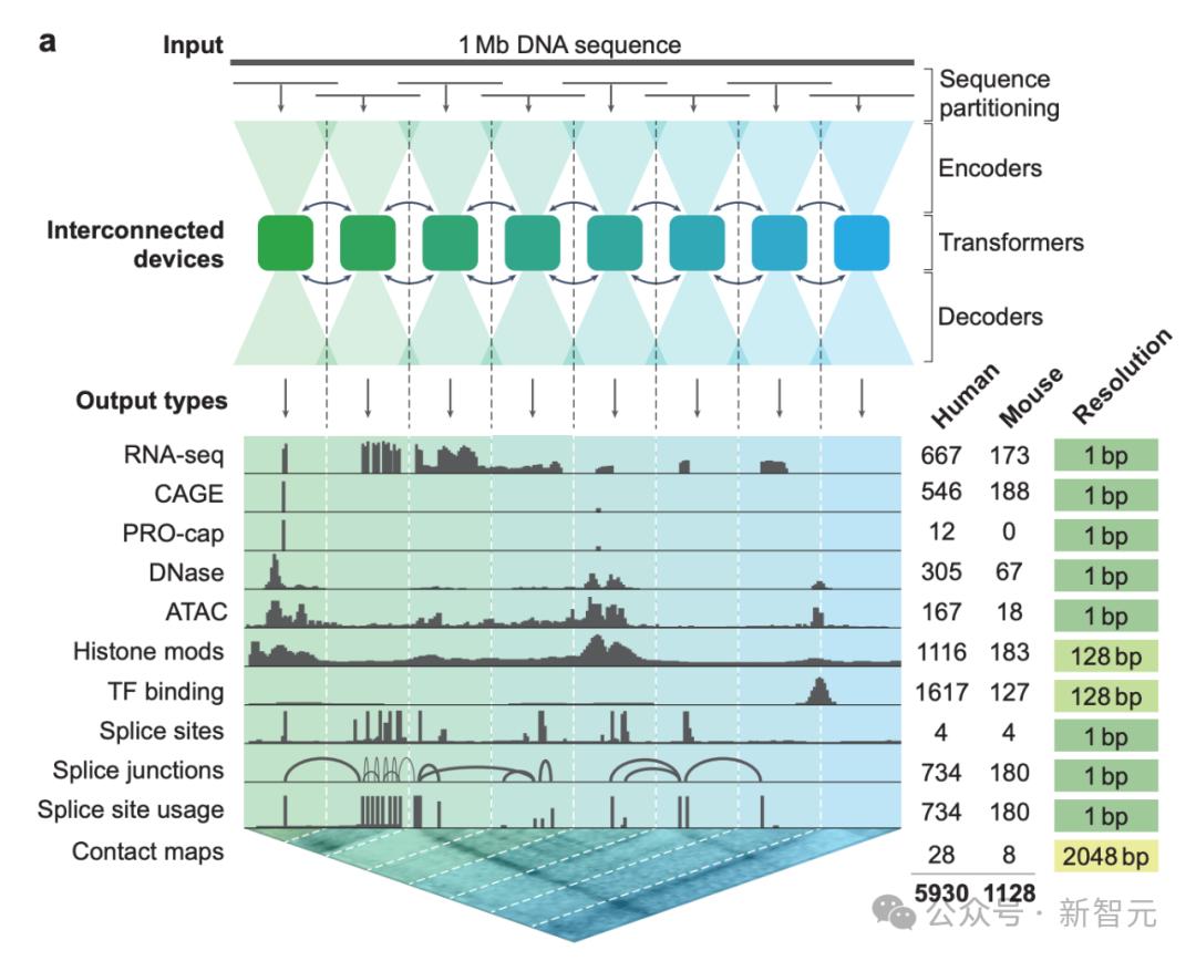 这款模型的预测范围非常广泛,包括了在不同的细胞类型和组织中,基因的起始与终止位点、基因的剪接位置、RNA的生成数量,以及哪些DNA碱基是可访问的、哪些在空间上相互靠近、哪些与特定的蛋白质结合等。