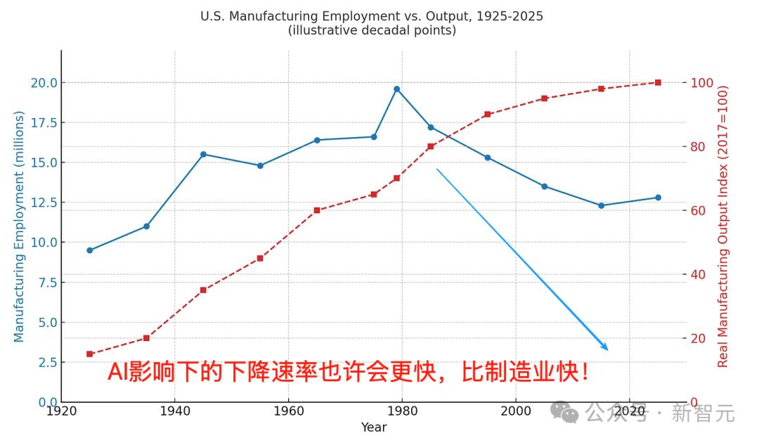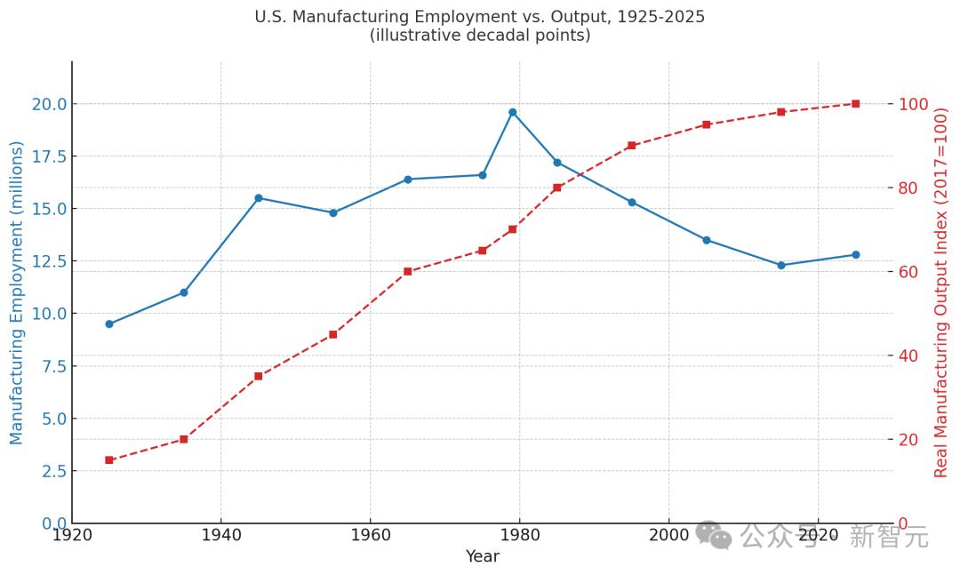 到如今2025年,尽管制造业总产出持续增长,美国在该领域雇佣的人数仅为当年峰值的一半而已。
