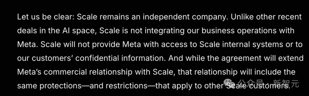 Scale AI信誓旦旦说道,不会将公司业务运营与Meta整合;也不会向Meta提供对内部系统或客户机密信息的访问权限。