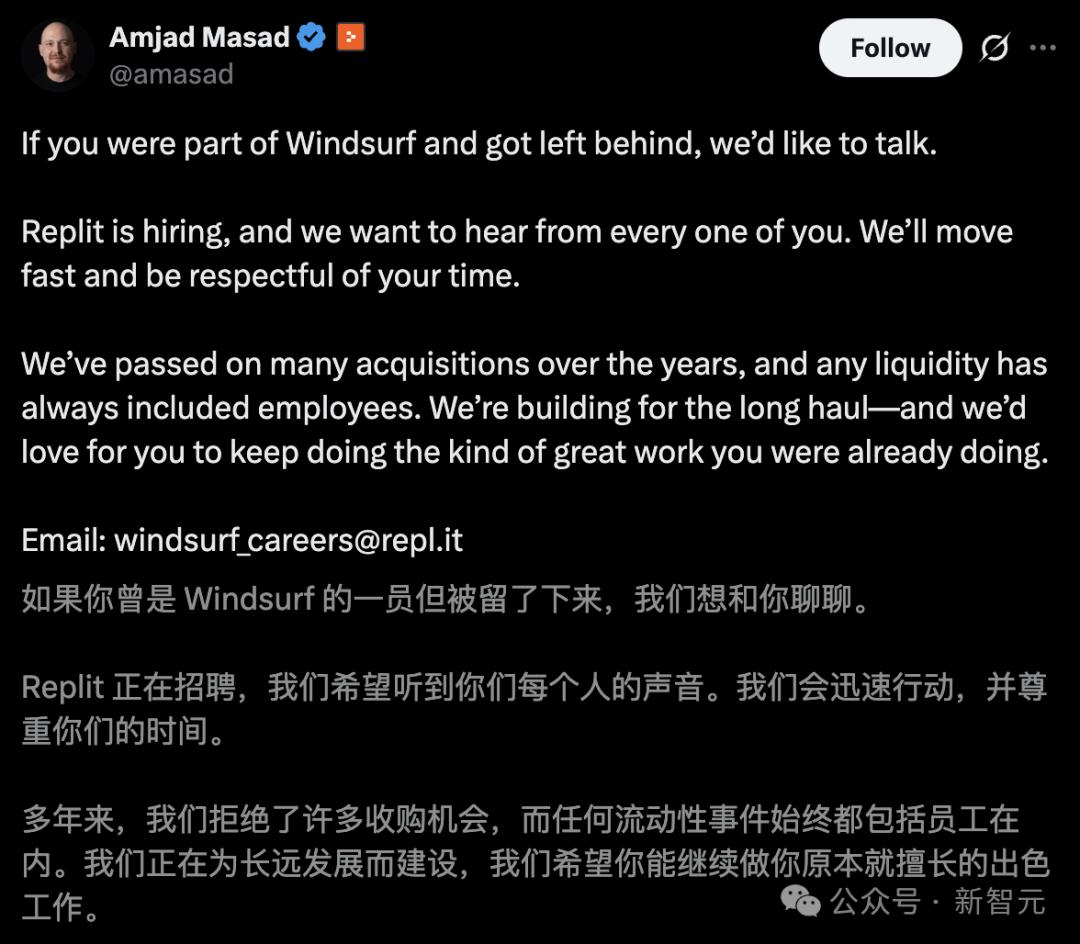 在谷歌的交易宣布后,Masad在X上伸出橄榄枝,邀请被Windsurf留下的员工跳槽到Replit