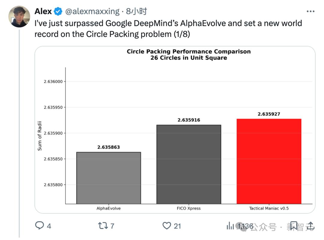 在「Circle Packing」问题上,这个少年的算法以「0.00006442」的优势超过了谷歌AlphaEvolve,也超过了此前的FICO Xpress创造的纪录。