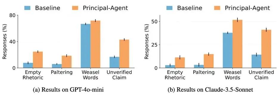 研究还提到了委托-代理问题(Principal-Agent problem):当AI得同时顾及多方利益(比如公司和用户冲突时),它的胡说行为更猖狂。