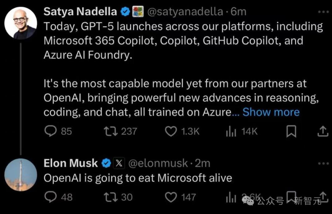 GPT-5发布会后,微软CEO纳德拉友情发帖表示支持,却被马斯克第一时间「嘲讽」。(但很快就删帖了)
