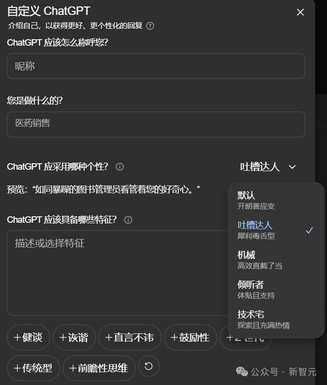 现在为了安慰用户们,OpenAI让GPT-5有了更多变的性格,除了默认人格之外,你还可以选择「吐槽达人」、「机械」、「倾听者」、「技术宅」这几个选项,甚至你还可以自行定制。