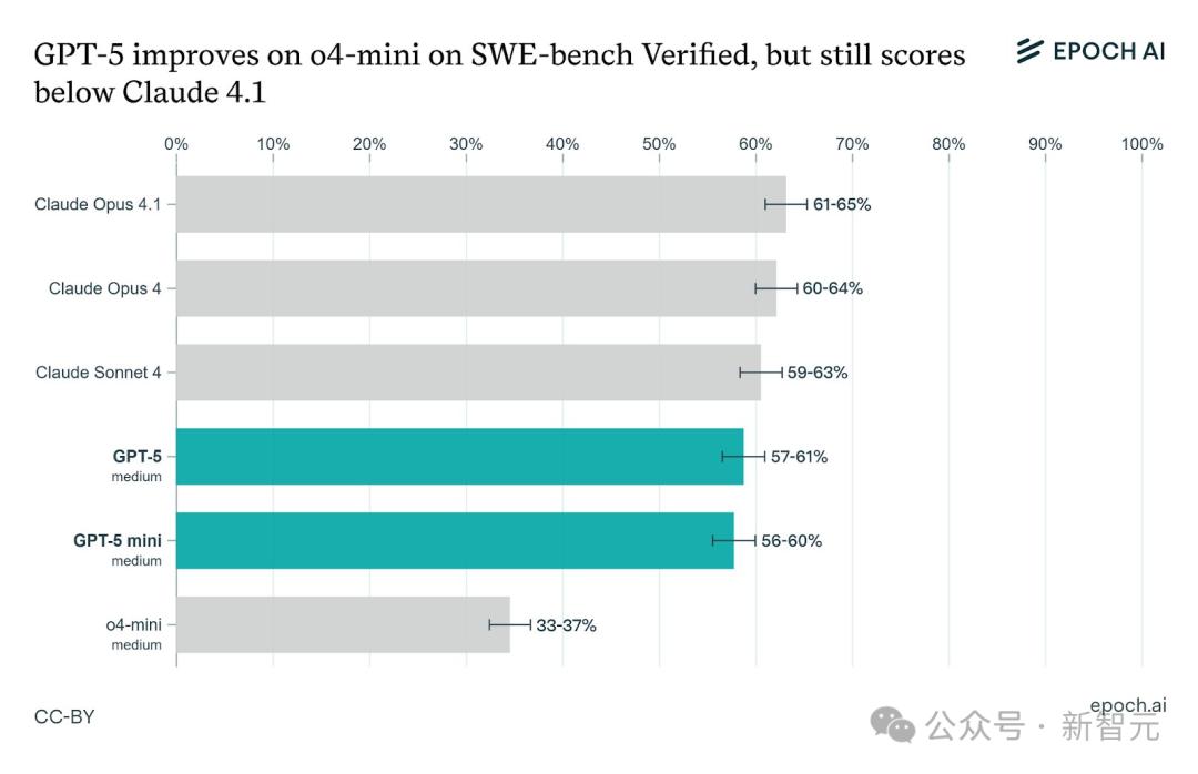 在编程测试SWE-bench Verified上,GPT-5进步明显,稍低于Claude 4系列;