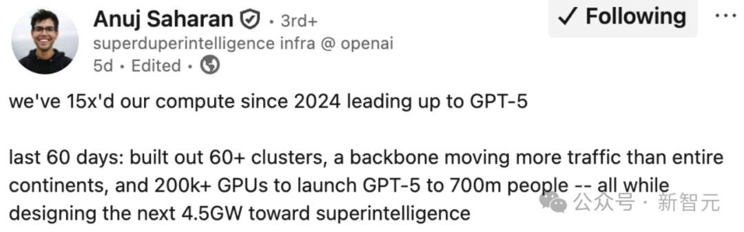 为了GPT-5,OpenAI的Anuj Saharan透露算力增加了15倍,动用超过20万块GPU,服务7亿用户。