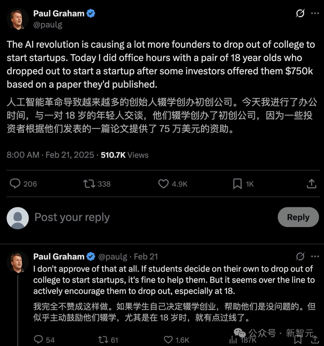 社交媒体上,AI辍学标签「#AI Dropout」下的帖子疯传,一条高赞推文写道:「最聪明的一代人正在离校,以正面引导AGI的诞生。」