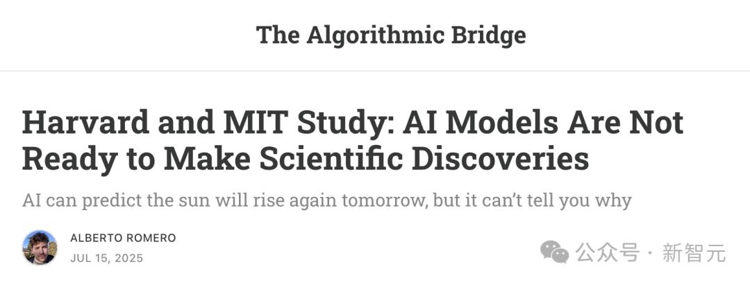 哈佛与MIT上月联合发表在《算法之桥》的研究指出,当前AI模型远未达到真正的科学发现能力,暗示恐慌可能被夸大。