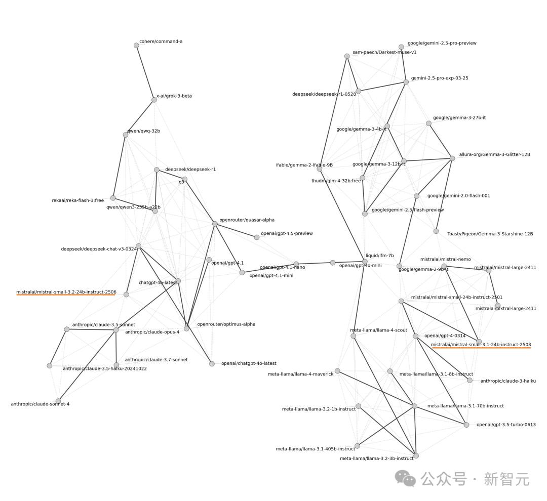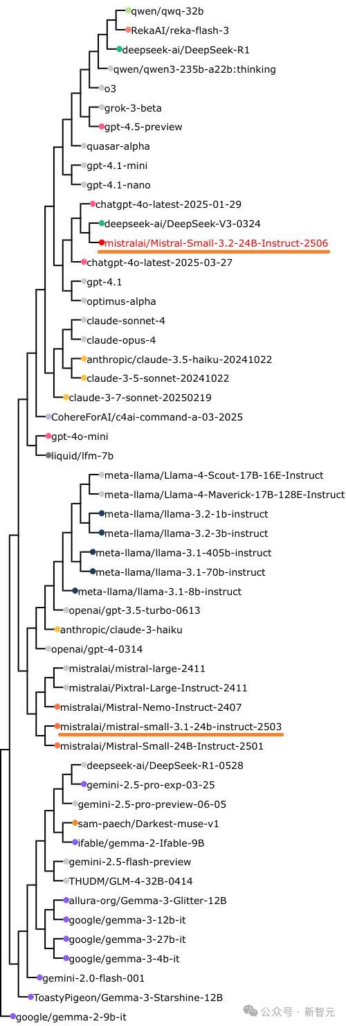 肉眼可见,Mistral-small-3.2和DeepSeek-v3在谱系图中的位置非常接近,从而表明它们的特征是极其相似的。