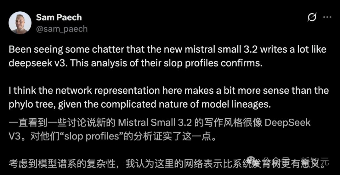其实早在今年6月,就有一位火眼金睛的AI行内人发现,Mistral Small 3.2写的东西,它怎么这么像DeepSeek呢!