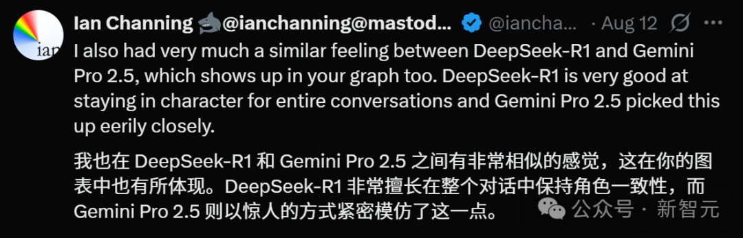 甚至还有人发现,连Gemini Pro 2.5都和DeepSeek-R1之间有非常相似的感觉。