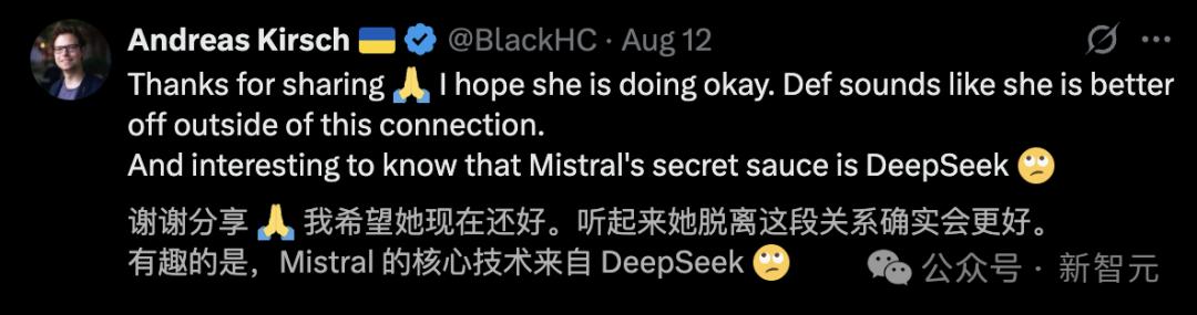 也就是说,这位Mistral离职的女员工,不仅在小作文中曝光了自己和前男友、Mistral同事的感情纠葛,还爆出Mistral套壳DeepSeek的丑闻。
