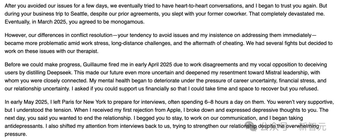 更为劲爆的是,这个重磅大瓜还是从一篇Mistral女员工的「分手小作文」里曝出来的。