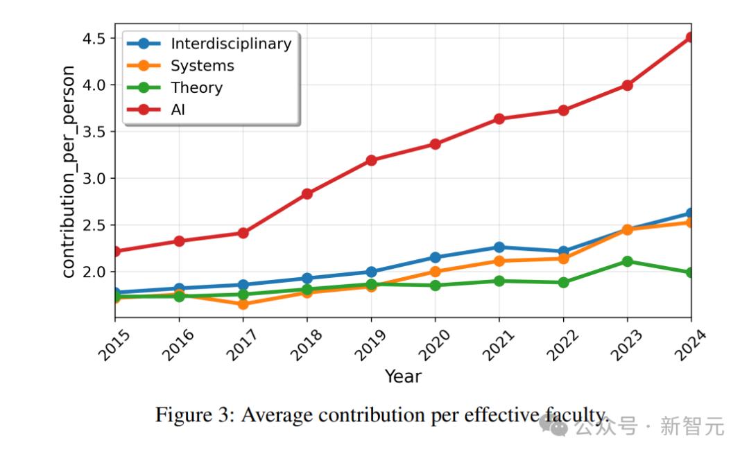尤其是在2023-2024年,由于LLM的爆炸式进展,AI研究者的年均发文数已经超过了4.5篇,并且还有继续飙升的趋势。