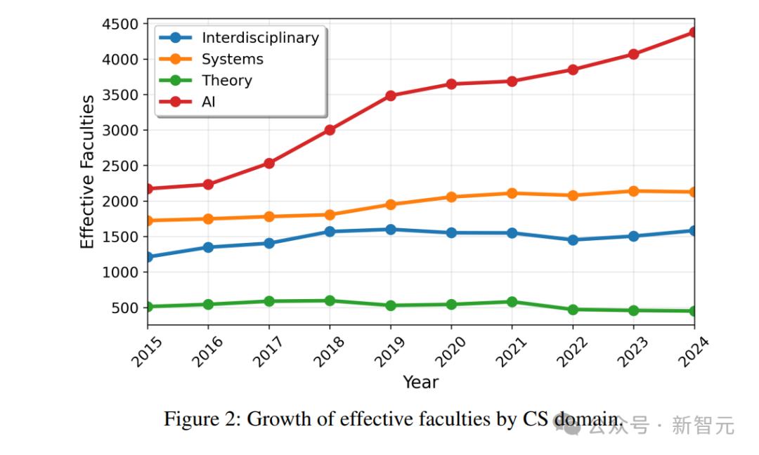 研究者们对CS不同领域过去十年的出版趋势进行了分析,通过使用「Effective Faculties」这一新颖的指标,再结合CSRankings的数据,他们发现了以下现象。