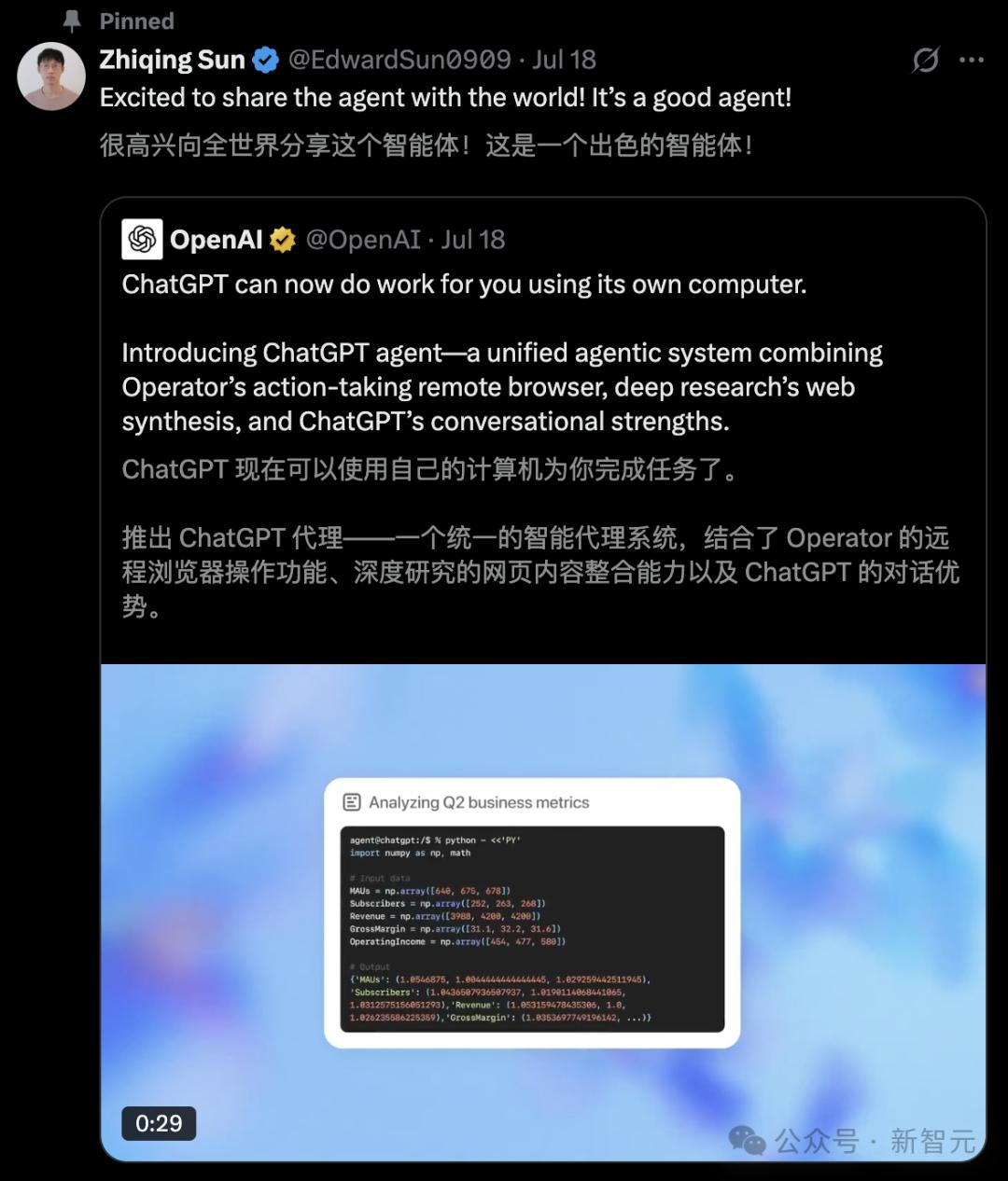 7月18日,OpenAI直播ChatGPT Agent发布,网友曾预测,与奥特曼坐同框的孙之清将会被挖走。