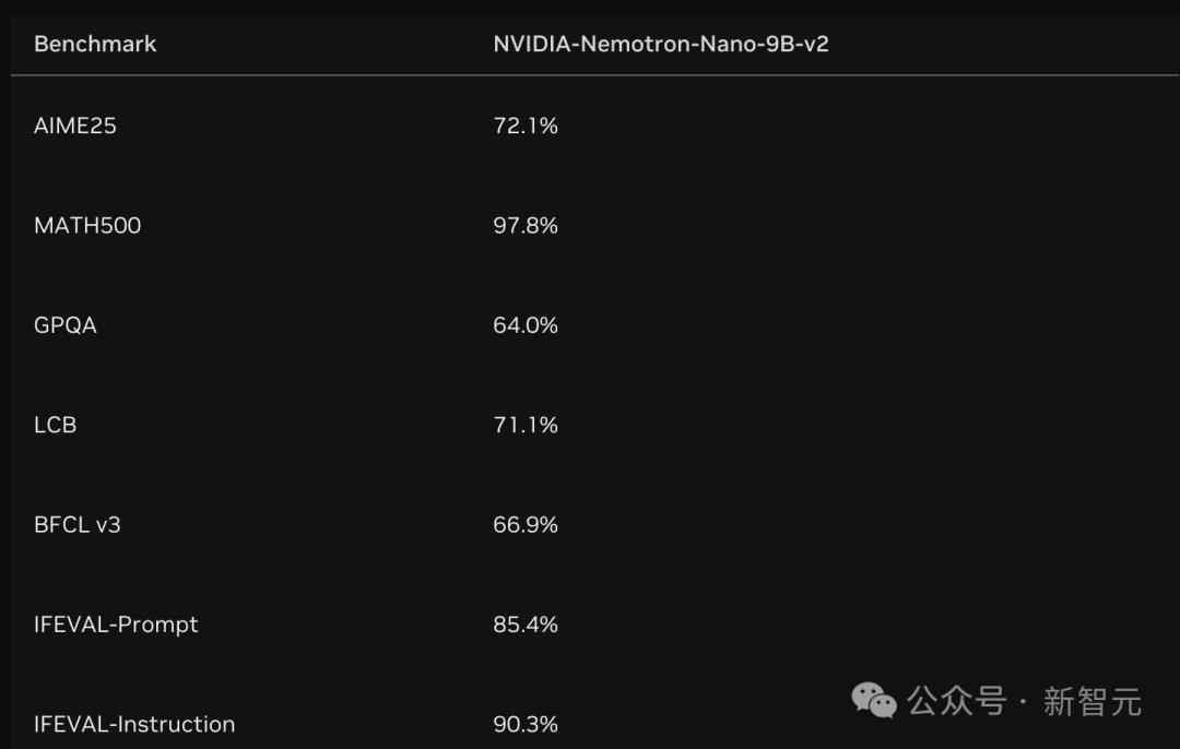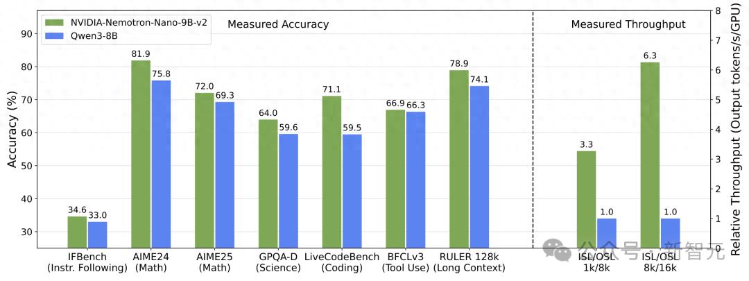 与Qwen3-8B等同级别强手相比,Nemotron-Nano-9B-v2在各大推理基准测试中,精度平起平坐,甚至更胜一筹!