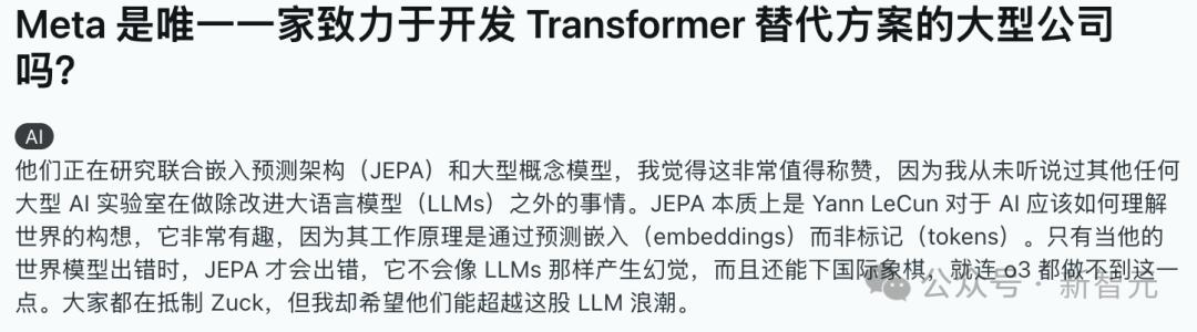 比如Meta公开推进JEPA(联合嵌入预测架构)和大概念模型(LCMs)、状态空间模型(就是Mamba)、记忆模型或扩散语言模型等。