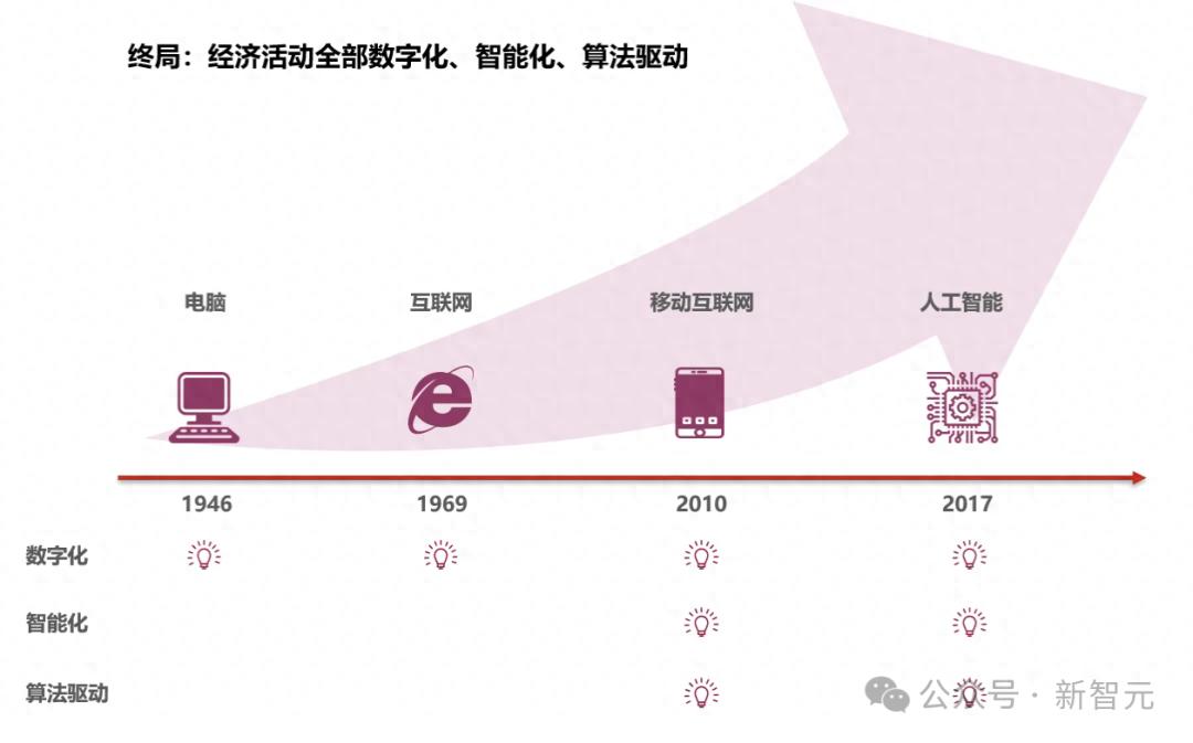 人类所有的经济活动,从这一刻起,开始有先后顺序地被数字化。在数字化之后,算法可以发挥作用,经济活动可以由算法驱动,从而实现智能化。由此看来,人类整个经济活动迈向数字化似乎是一个必然。
