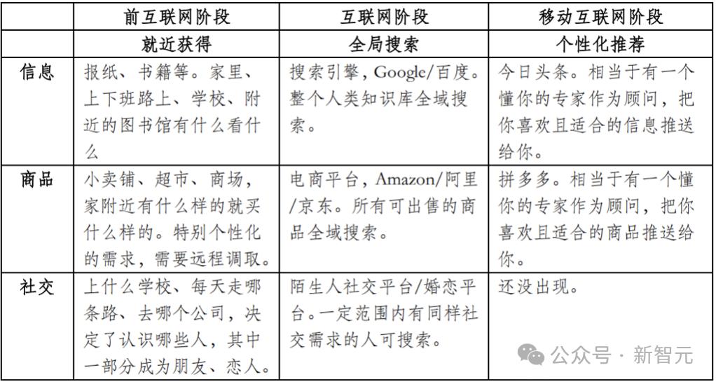 可以看到,信息、商品、社交伙伴这三类需求,在前互联网阶段、互联网阶段、移动互联网阶段,分别通过就近获得、全局搜索、个性化推荐三种方式实现匹配。