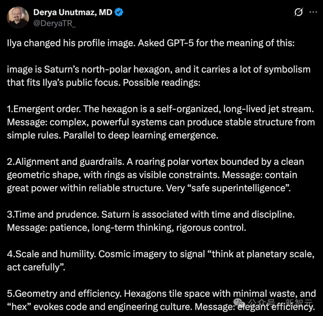 这张图是土星的北极六边形风暴,它蕴含的多种象征意义,与Ilya一贯公开关注的焦点十分契合。