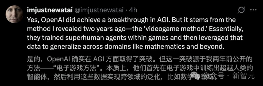 这一突破是——电子游戏法,本质是:在游戏里训练出超人水平的AI智能体,然后再利用这些数据,将其能力泛化到数学等其他领域。