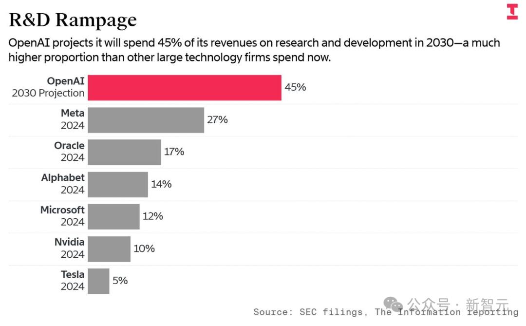 相比于疯狂从OpenAI挖人的Meta,OpenAI的研发成本高到断档,预计到2030年将会占到公司总收入的近一半,而Meta只有四分之一。