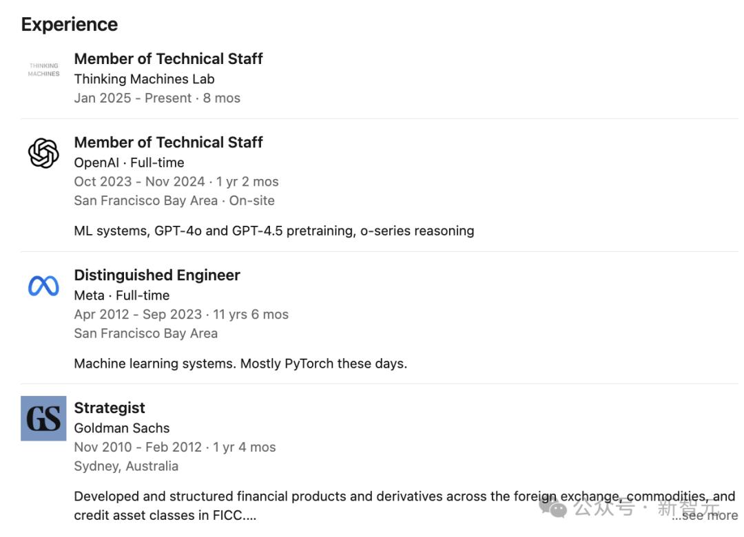 在此之前,他曾在Meta干了11年;随后2023年加入OpenAI,重点参与了GPT-4o、GPT-4.5预训练,o系列推理的研发。