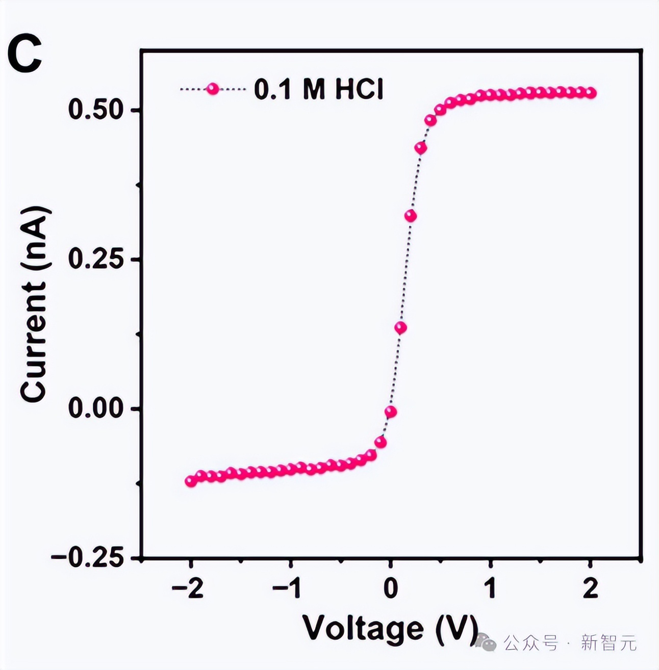 实验结果令人兴奋:当使用盐酸(HCl)溶液时(其中的阳离子主要是质子H⁺),芯片的电流随电压变化呈现出强烈的非线性。
