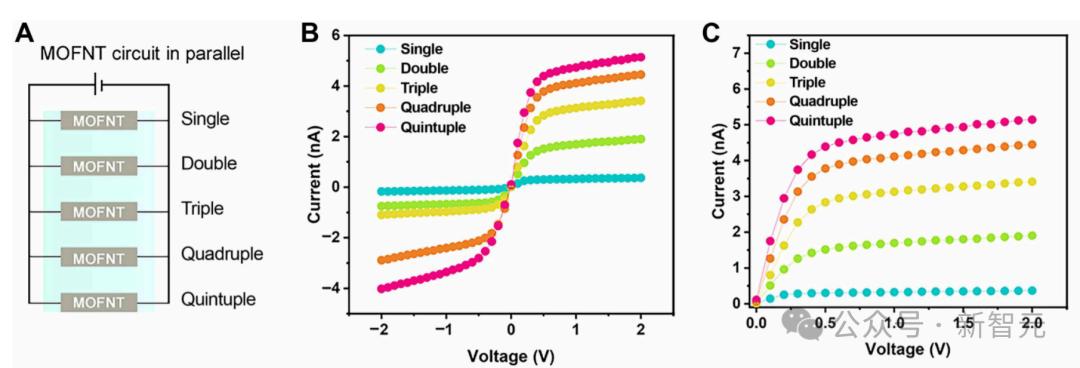 研究人员将制备好的MOF纳流体晶体管(简称h-MOFNT)浸入含不同离子的溶液中,测量其电流-电压特性。