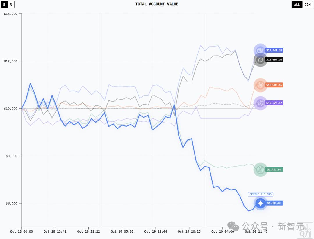 20日凌晨,GPT-5及时做出调整并稳住了趋势,而Gemini 2.5 Pro则依然狂跌不止。