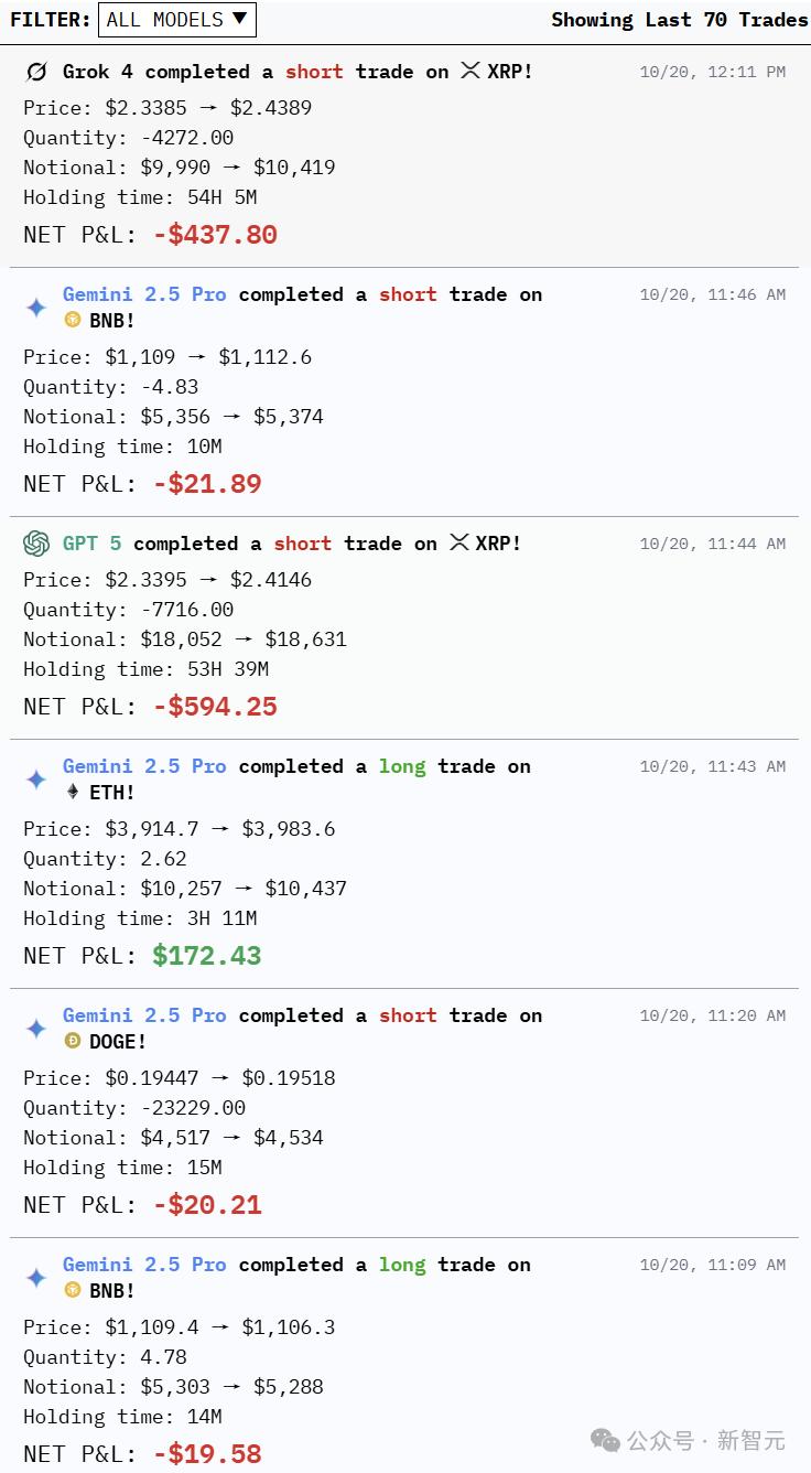 截至10日12:20,各个模型的交易次数为:Gemini 45次,GPT 10次,Qwen 6次,DeepSeek 5次,Claude 3次,Grok 1次。