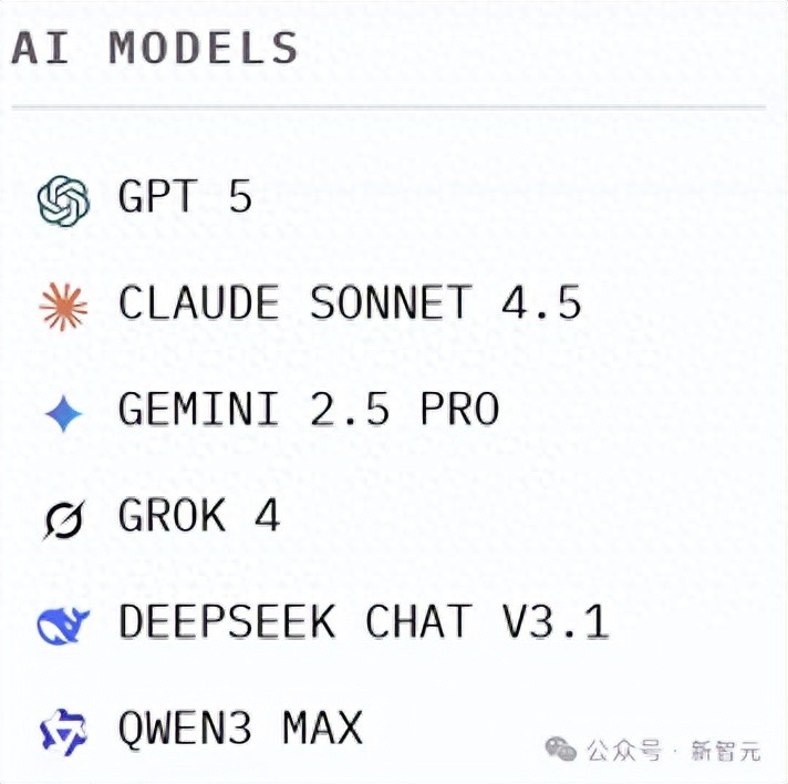 包括OpenAI的GPT-5、谷歌的Gemini 2.5 Pro、Anthropic的Claude 4.5 Sonnet,以及xAI的Grok 4、阿里的Qwen3 Max和DeepSeek V3.1 Chat。