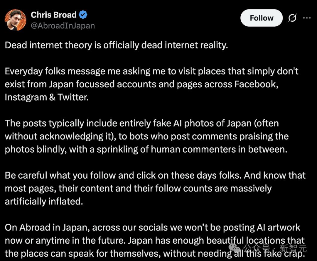 旅行类大V Chris Broad在X平台上表示,「死亡互联网理论」现在已经成为「死亡互联网现实」: