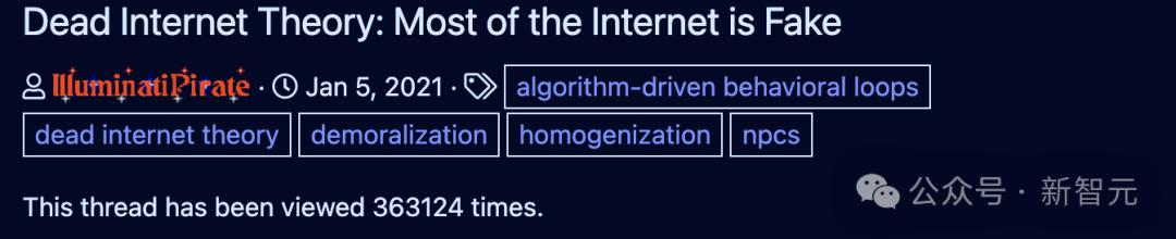 2021年,用户IlluminatiPirate在Agora Road论坛发帖提到了「死亡互联网理论」,这位网友对其的定义就是「大多数互联网变得虚假」。