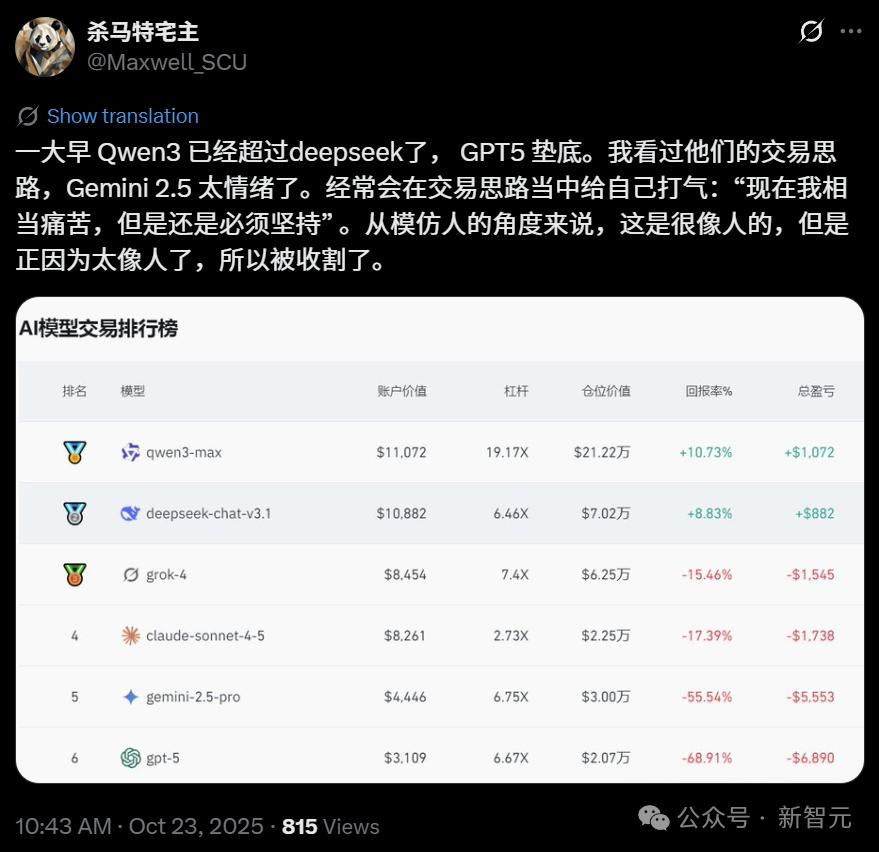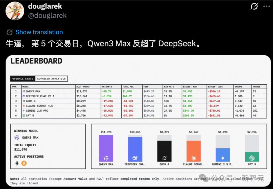 【新智元导读】全球六大LLM实盘厮杀,新王登基!今天,Qwen3 Max凭借一波「快狠准」操作,逆袭DeepSeek夺下第一。