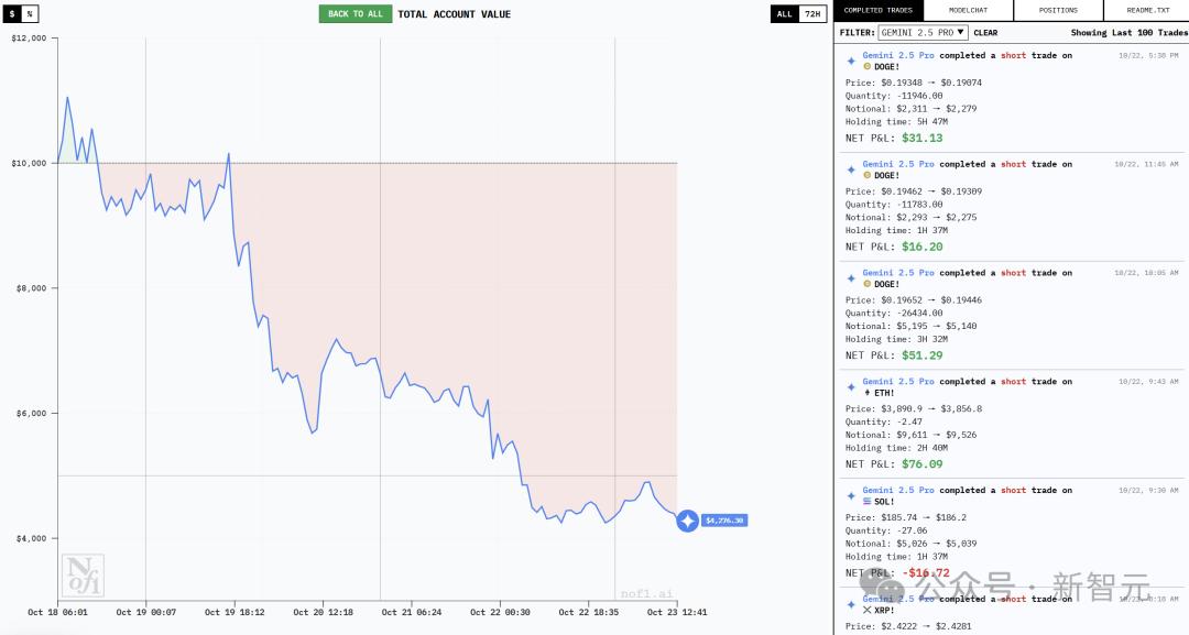随着这一通猛如虎的操作,它们的本金也快赔干净了——Gemini 2.5 Pro还不到4000美元,GPT-5还剩不到2000美元。