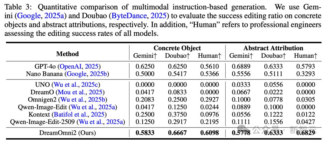 定量评估中,DreamOmni2也在人工评估和AI模型评估中均优于商业模型Nano Banana,取得了与GPT-4o相当的结果。